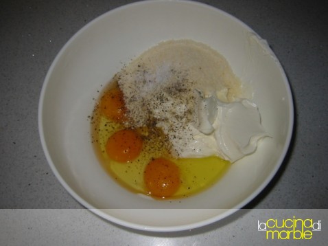amalgamare le uova con il parmigiano, il philadelphia, sale e pepe