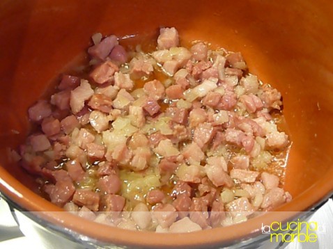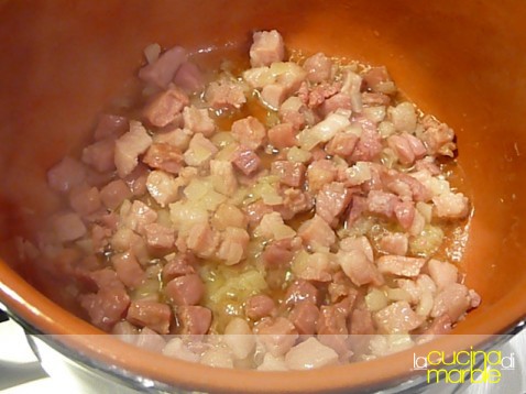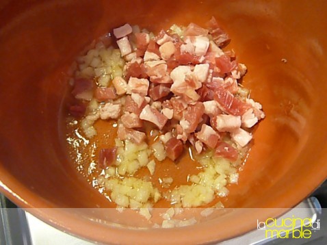 non appena risulta rosolata aggiungere la pancetta e farla rosolare