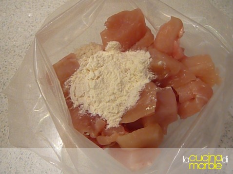 tagliare a pezzetti regolari i petti di pollo (io lo faccio sempre con la forbice)