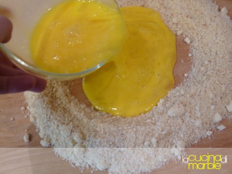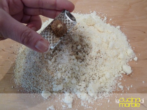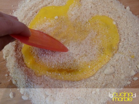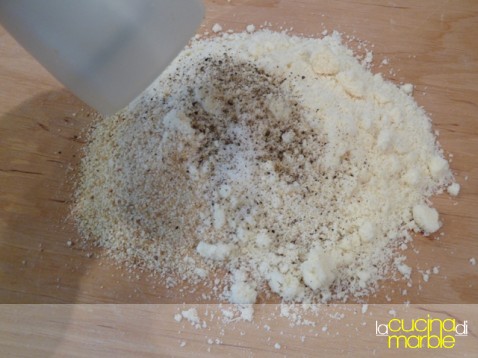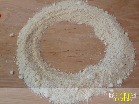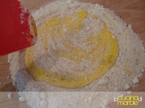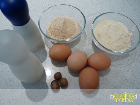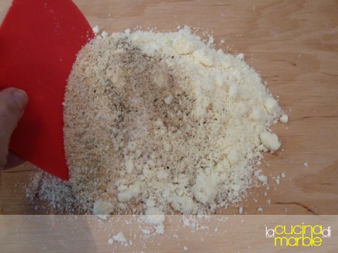 sulla spianatoia unire gli ingredienti secchi: pangrattato, parmigiano, sale, pepe e noce moscata, mischiare il tutto