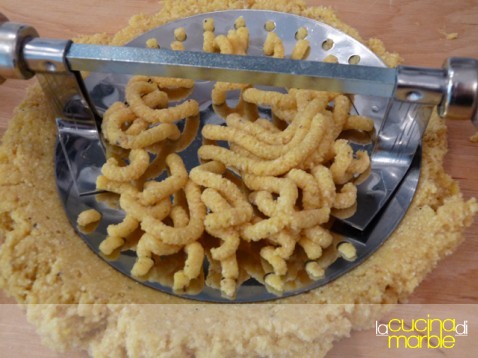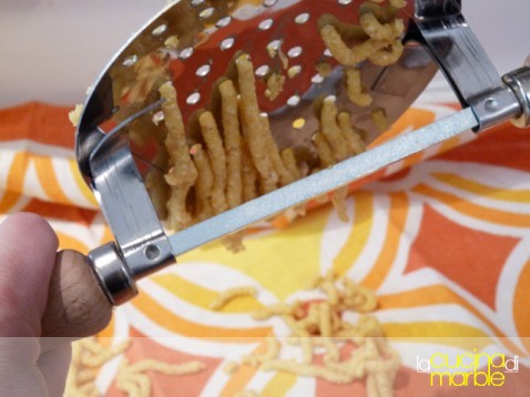 prelevare dei pezzi di impasto e passarli o nello schiacciapatate o nell'apposito attrezzo in modo da ricavare i passatelli