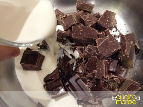 mettere la cioccolata spezzata in un tegame con la panna ed il burro, porre sul fuoco a bagnomaria e far fondere delicatamente mescolando fino a che non avremo un composto liscio,