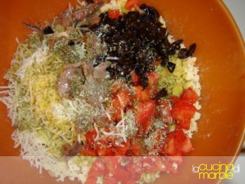 riunire in una terrina la mollica, i pomodori tagliati a dadini abbastanza piccoli, le olive e le acciughe sminuzzate, abbondante parmigiano grattato, origano a piacere, sale, un po' d'aglio schiacciato ed una quantità di olio tale da riuscire a condire il tutto