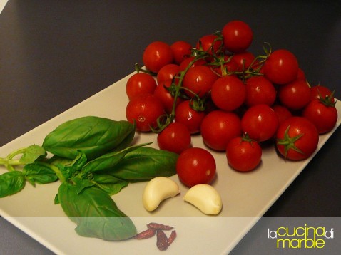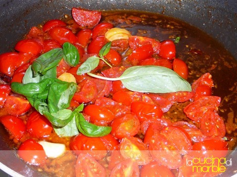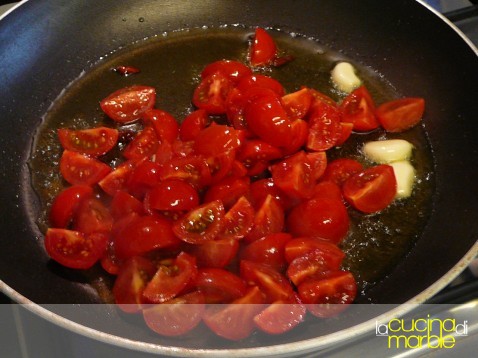 versare i pomodori nel tegame e far cuocere pochissimi minuti (devono solo appassire leggermente)