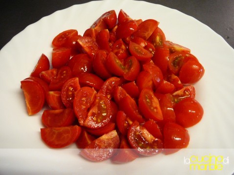 tagliare i pomodorini a pezzi grossi