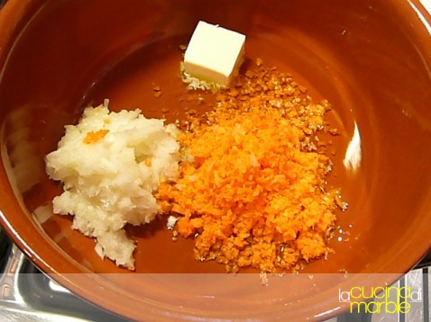 tritare grossolanamente la cipolla e la carota