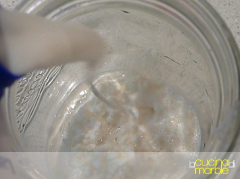 mescoliamo il tutto, richiudiamo il contenitore lasciando una fessura in modo che circoli aria, e lasciamo fermentare per almeno 48 ore (o più a seconda della temperatura e dell'umidità esterne), fino ad ottenere una massa più compatta e fermentata (identica a quella per la preparazione del latte di kefir)