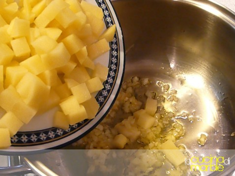 appena la cipolla risulta appassita, unire le patate e farle insaporire nel soffritto