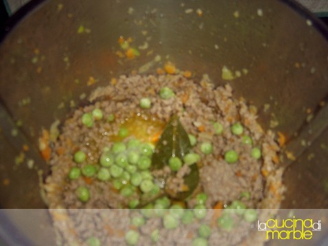 aggiungere la passata di pomodoro, i piselli, sale, pepe, eventualmente noce moscata e la foglia di alloro