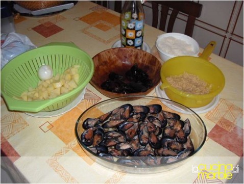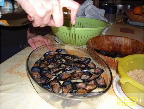 aprire le cozze, staccare il mollusco dalla semivalva, lasciarlo nell'altra staccato anche da questa, raccogliendo nella pirofila l'acqua contenuta nei mitili