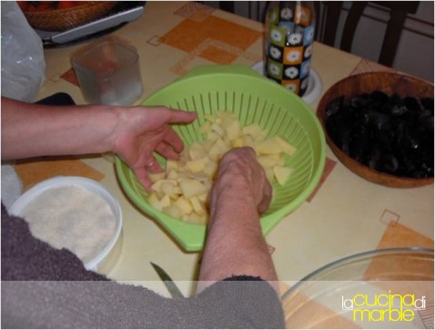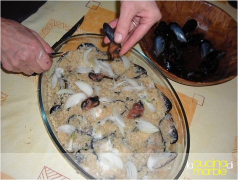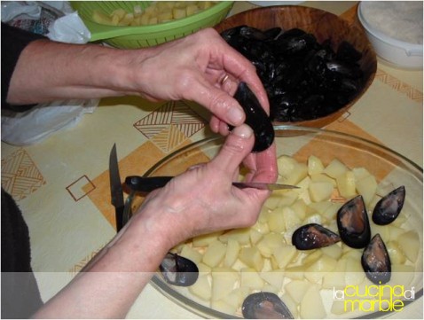 coprire le patate con lo strato di cozze aperte
