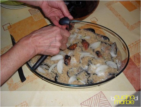 il riso è l'unica componente vegetale ospite infatti non è coltivato in puglia (quando mai! come coltivarlo nella nostra regione carsica, perciò assetata ?). c'è chi usa quello precotto, noi abbiamo usato anche l'esotico basmati. vanno bene tutti, a condizione che tengano bene la cottura.