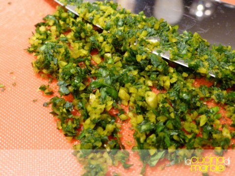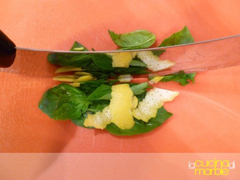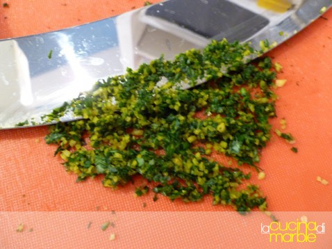 tritare finemente insieme alle foglioline di basilico