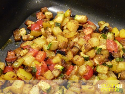 riunire in un tegame alto tutte le verdure (le patate le ho sbucciate, le melanzane no)