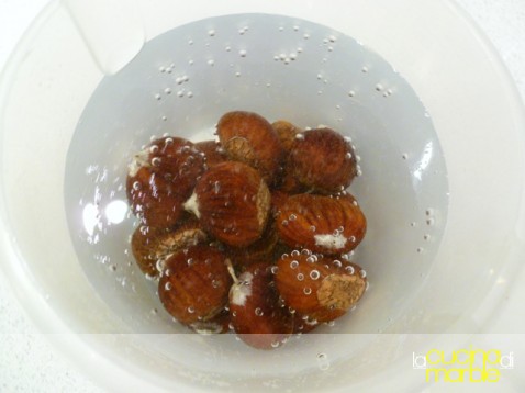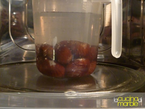 se non sono già lessate, procedere alla cottura delle castagne, io ho usato il metodo di cottura al microonde, senza aggiunta di aromi, solo un pizzico di sale