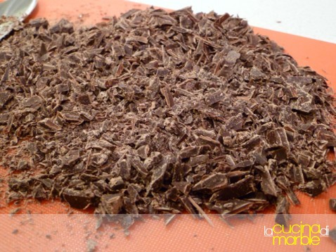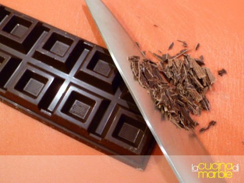 intanto tagliare il cioccolato per procedere poi al temperaggio, io ho usato anche qui il microonde con la tecnica del temperaggio ad induzione