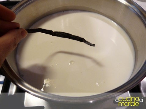 mettere in un tegame il latte, aggiungere 250 gr di zucchero e la stecca di vaniglia (magari incisa per la lunghezza)
