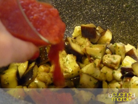 appena inizierà a rosolare bene aggiungere le melanzane e far rosolare tutto insieme