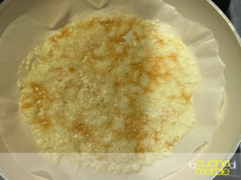rivestire una padella con carta forno, disporre sopra il pecorino in uno strato abbastanza spesso, circa 2-3 mm