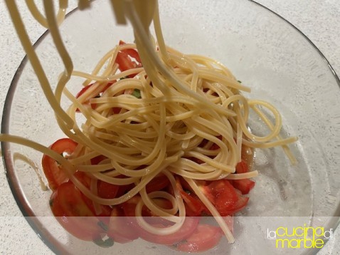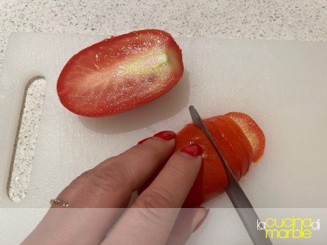 come prima cosa, anche un'oretta prima di cuocere la pasta, tagliare a fettine i pomodori, metterli in una ciotola e salarli