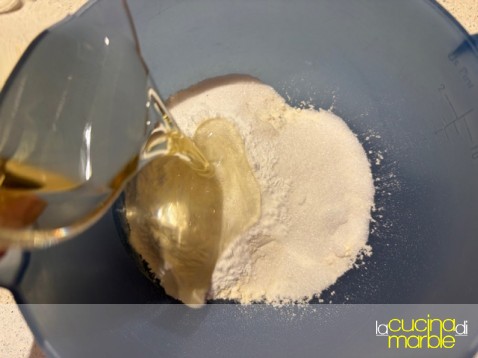 ho riunito in una ciotola prima gli ingredienti secchi: farina, zucchero, lievito