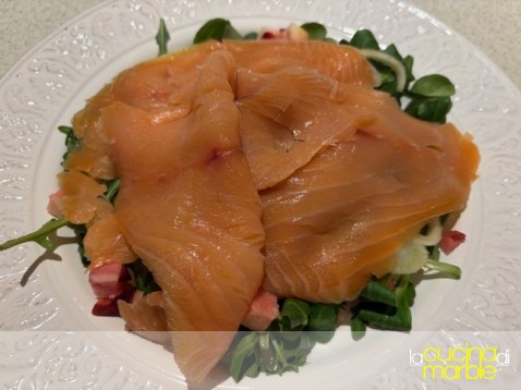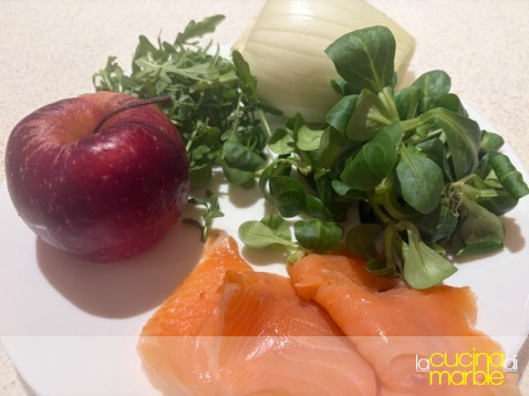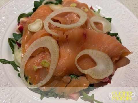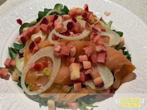 disporre sopra le fette di salmone, altre fettine di finocchio e altri dadini di mela