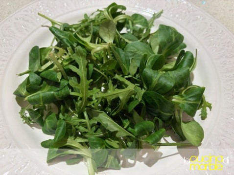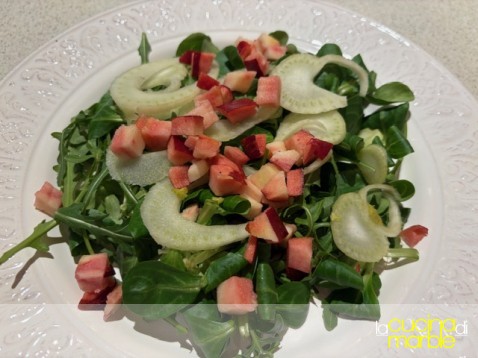 tagliare la mela a dadini, metterne una parte sopra l'insalatina preparata