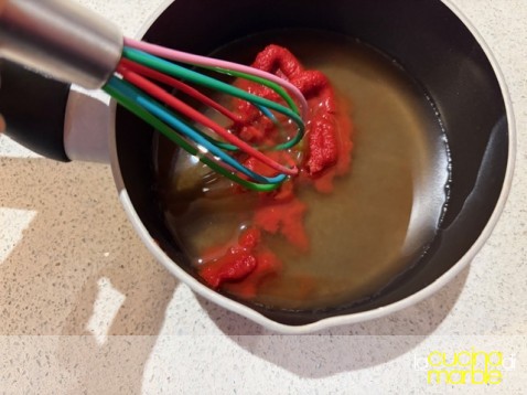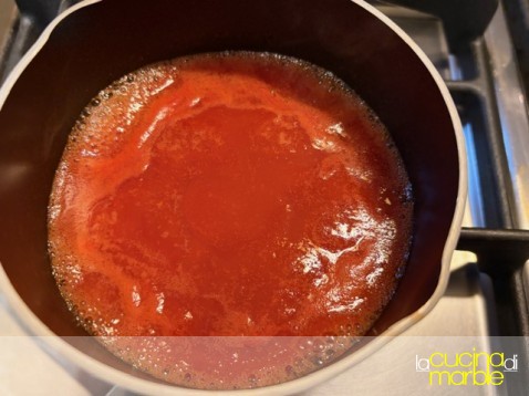 in un tegamino, meglio antiaderente, mettere la conserva di pomodoro, aggiungere l'acqua, il sale e l'aceto di mele