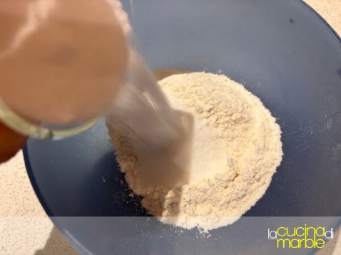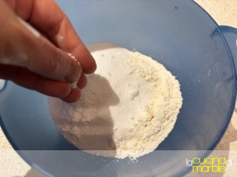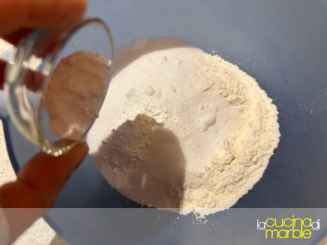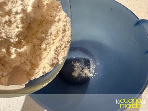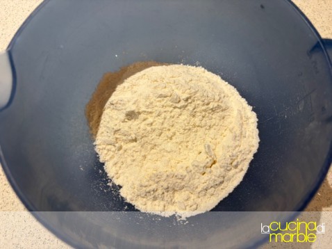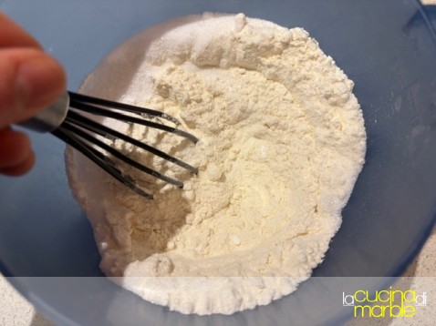 come prima cosa ho riunito gli ingredienti secchi: farina, zucchero, lievito e pizzico di sale