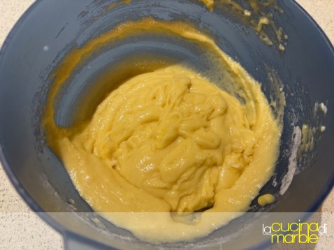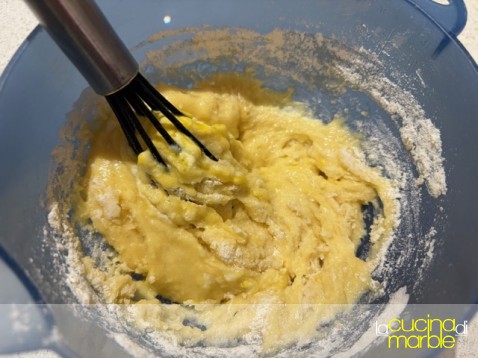 ho amalgamato con una frusta a mano (ovviamente si può usare anche una frusta elettrica) fino a che non ho ottenuto un composto omogeneo, basta pochissimo