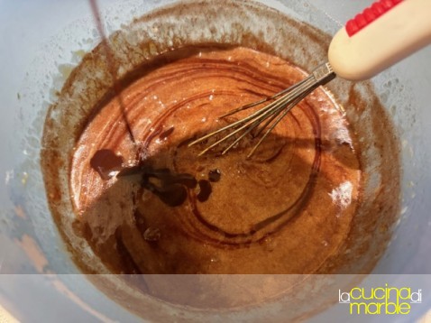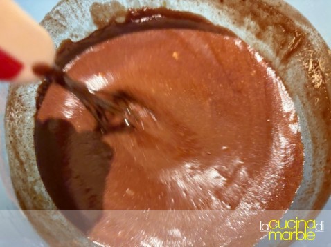 a questo punto aggiungere a filo la cioccolata fusa con il burro continuando a mescolare fino a che non si sarà ottenuto un bel composto omogeneo