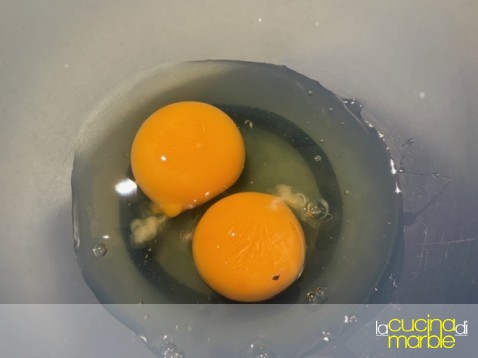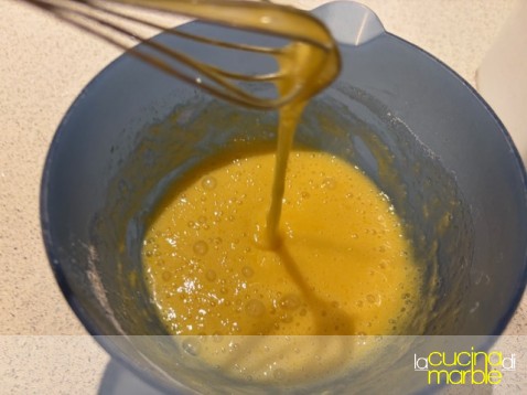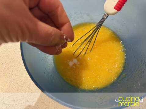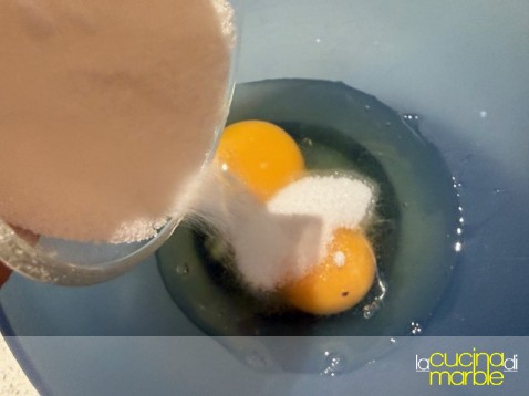 aggiungere alle uova lo zucchero, mescolare bene, magari con l'aiuto di una piccola frusta. considerate che il composto non dovrà montare, la frusta però aiuta ad amalgamare meglio il tutto
