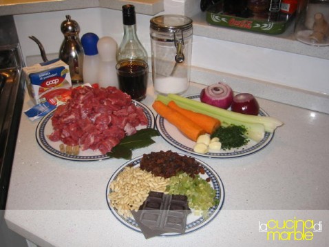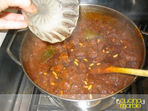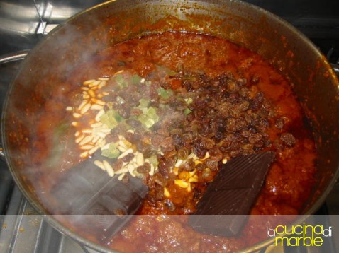 aggiungere al manzo gli ingredienti della finitura: canditi, uvetta, pinoli, la cioccolata tritata grossa, la soluzione di aceto e zucchero