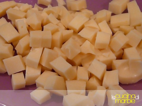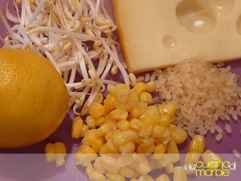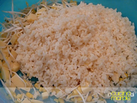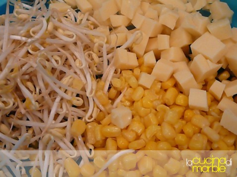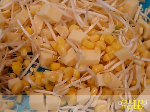 mentre lessa il riso tagliare il formaggio a dadini e unirlo ai germogli ed al mais
