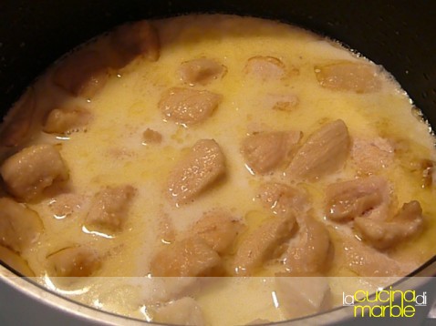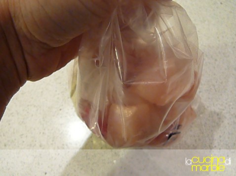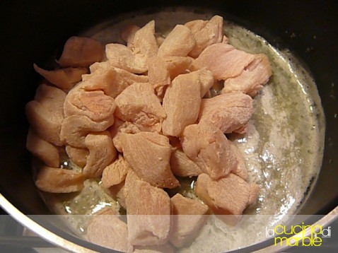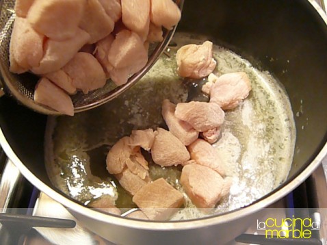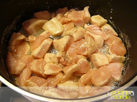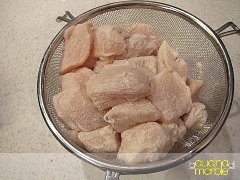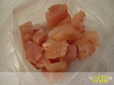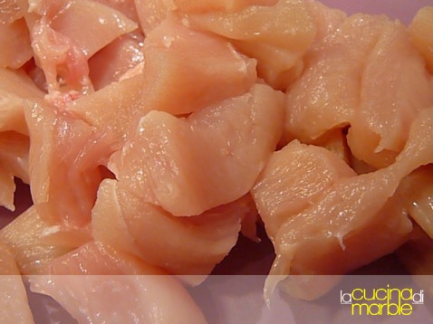 tagliare a pezzetti regolari i petti di pollo (io lo faccio sempre con la forbice)