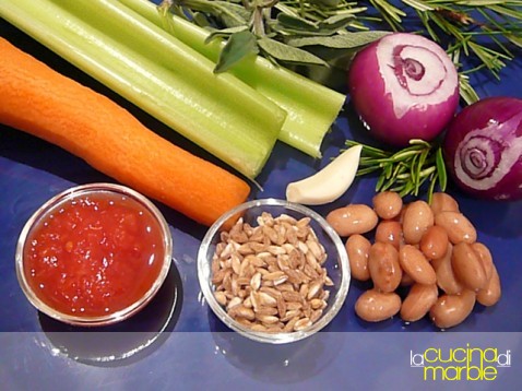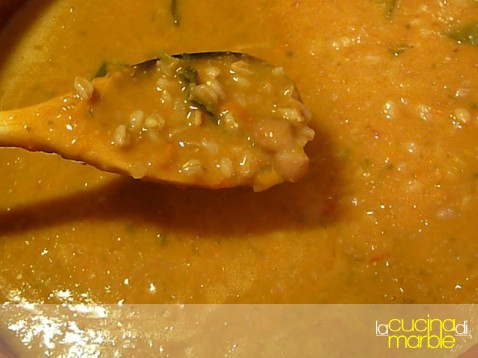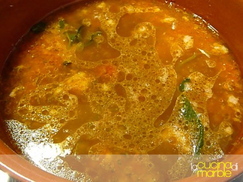 far prendere l'ebollizione, cuocere 5 minuti e aggiungere il farro precedentemente sciacquato e scolato
