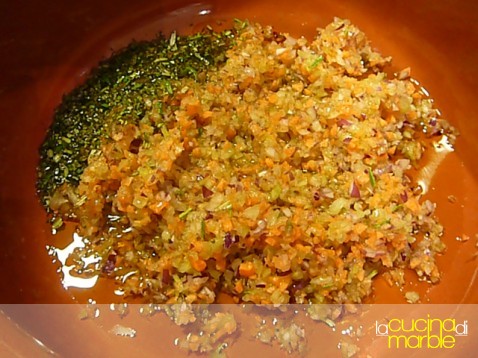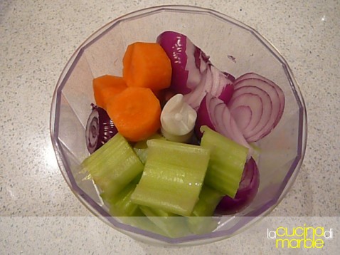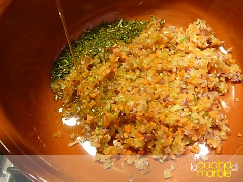 fare un trito grosso con cipolla, carota e sedano tritare finemente il rosmarino