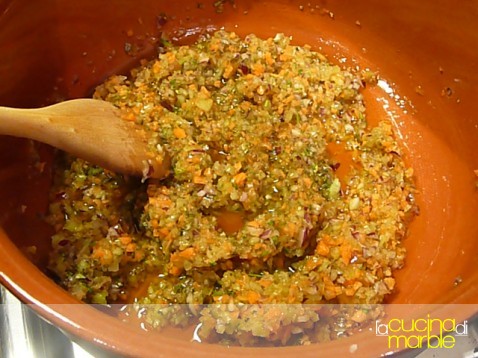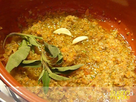 far rosolale dolcemente in olio il trito di odori con il rosmarino tritato