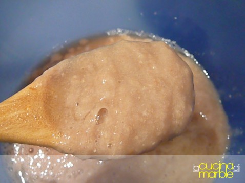 versare nel tegame 3-4 mestoli dell'acqua di cottura dei fagioli e la purea ottenuta