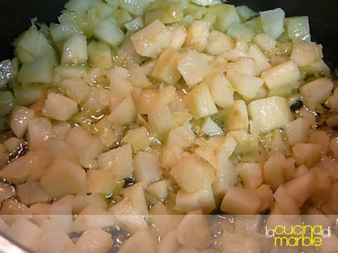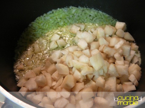 non appena la cipolla risulta trasparente, aggiungere il topinambur e farlo insaporire
