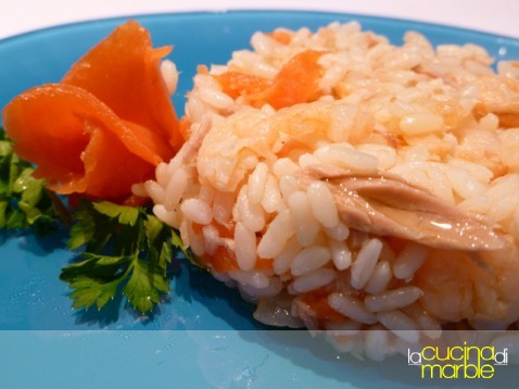 unire al riso i tre ingredienti: gamberetti, tonno e salmone