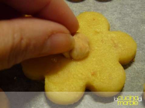 poi andremo a immergere a metà la nostra frutta secca (nelle foto delle nocciole) e la andiamo a poggiare sul biscotto già ritagliato e messo in teglia di cottura