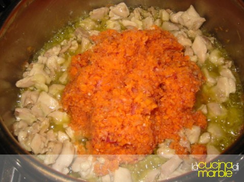 appena ha preso colore aggiungere la cipolla e la carota tritate finemente