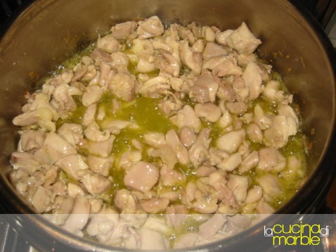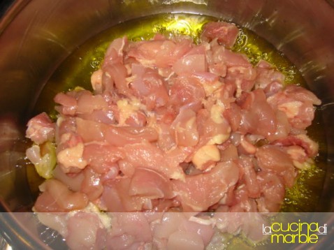 come prima cosa spellare e disossare il pollo, tagliarlo a pezzetti