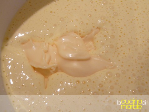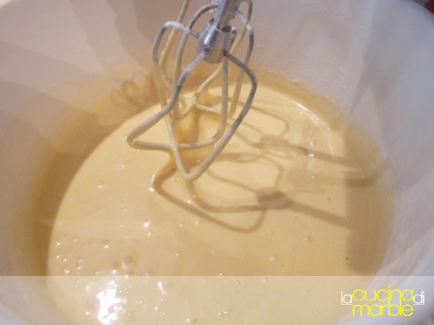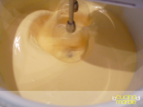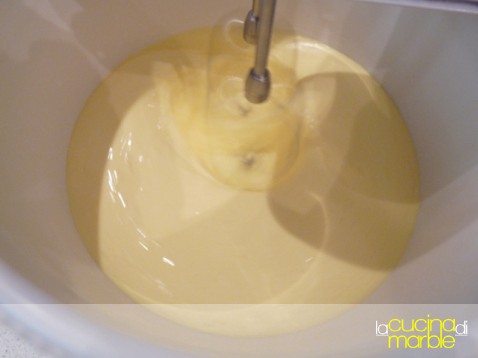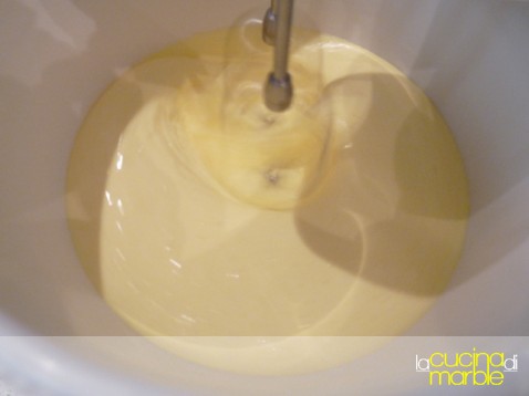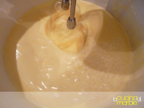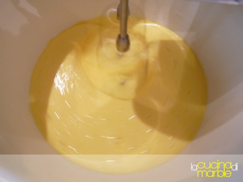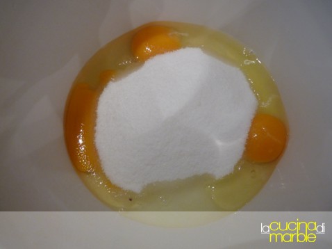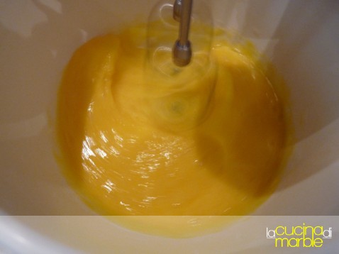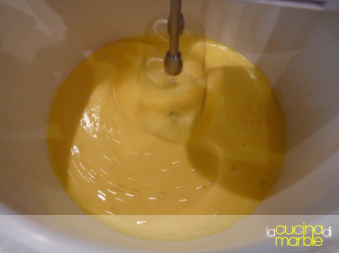 procedimento classico. montare le uova con lo zucchero fino ad avere un composto chiaro e ben montato