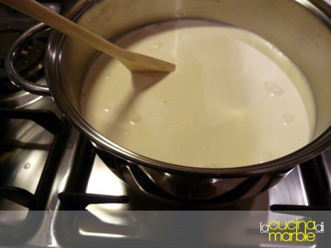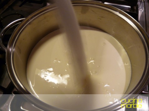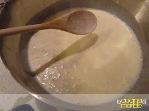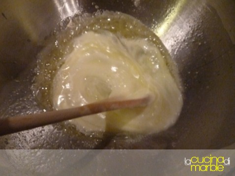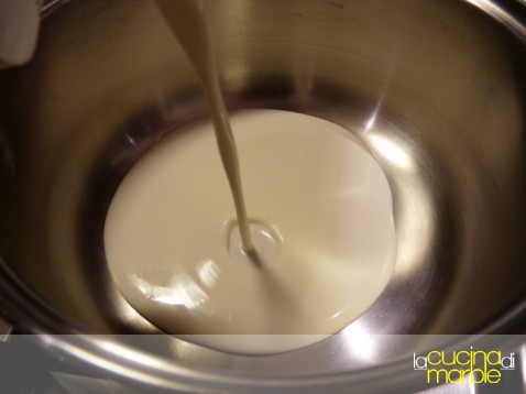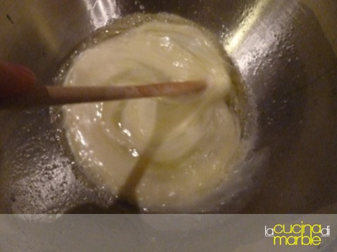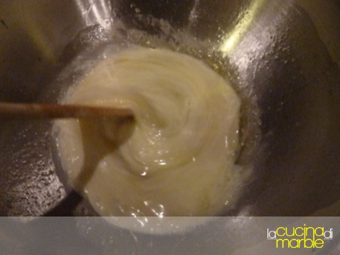 aggiungere poca alla volta la panna fredda, amalgamare via, via che si aggiunge