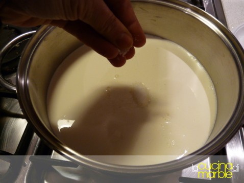 mettere la panna in un tegame, aggiungere lo zucchero ed il pizzico di sale