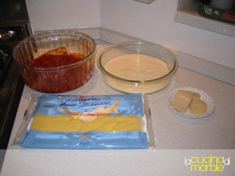uno strato di lasagne, altra besciamella, altro sugo e una spolverizzata di parmigiano grattugiato
