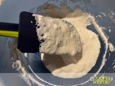 si otterrà un composto molto morbido, non liquido ma quasi (la farina 0 e la minor aggiunta di acqua lo rende "meno" liquido, direi l'optimum e di migliore riuscita)