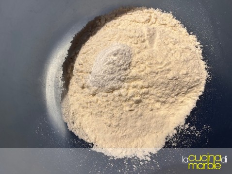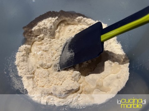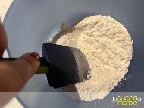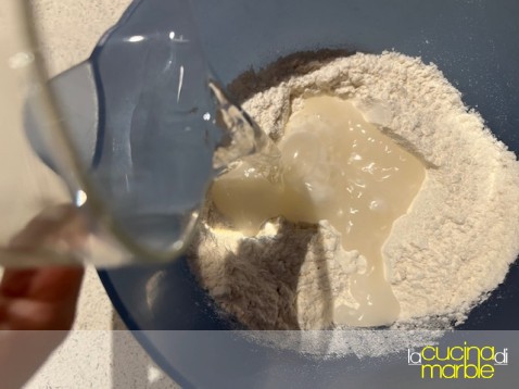 io procedo amalgamando farina e lievito, aggiungo l'acqua frizzante, mescolo tutto insieme